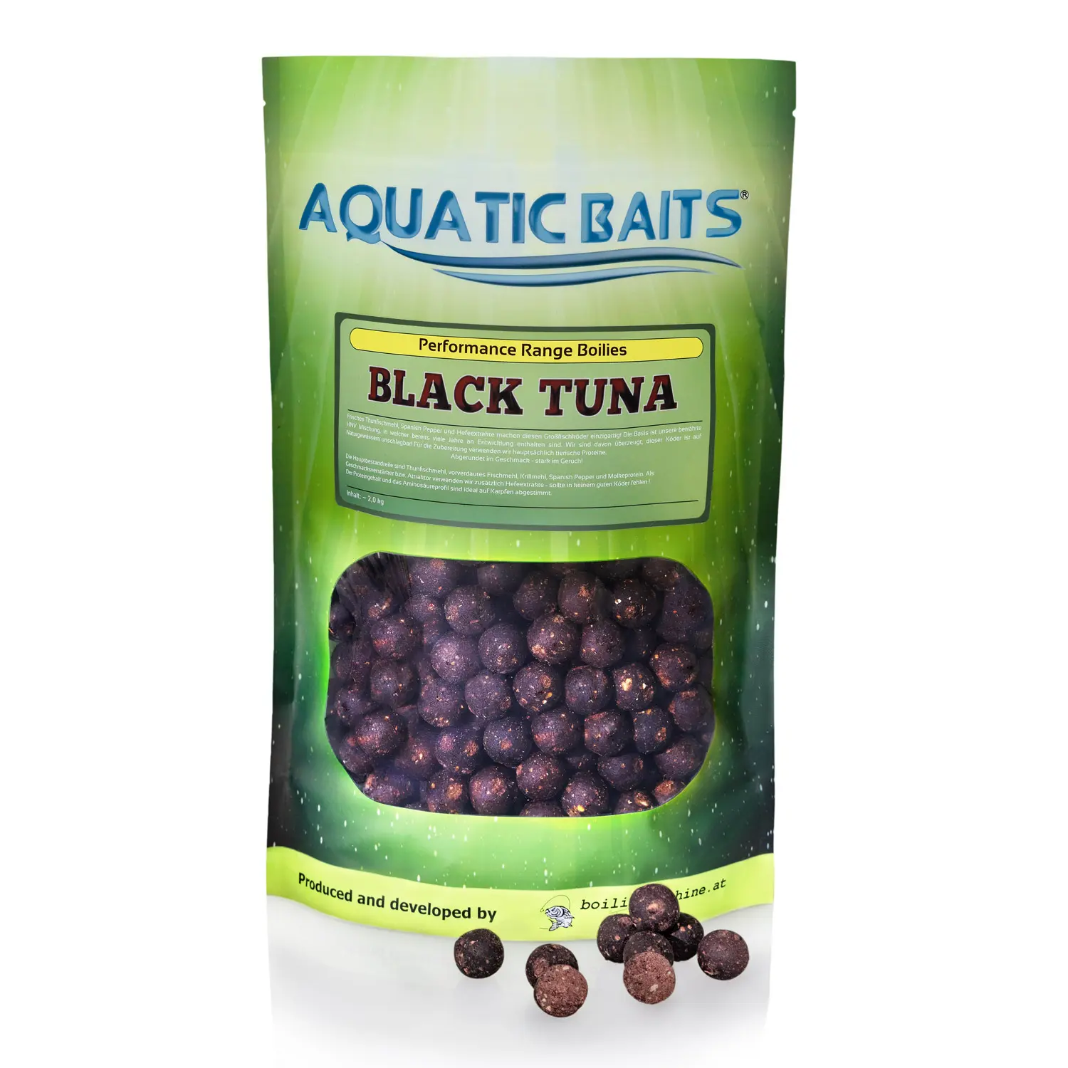 Velmi kvalitní, v chuti a vůni intenzivní tuňáková moučka, zkombinovaná s tmavou krevní moučkou jsou základy tohoto boilies. Velmi silný tuňákový zápach, díky kterému se tyhle kuličky vymykají mezi námi známými boilies, což s nich dělá pro kapra neznámou nástrahu.
