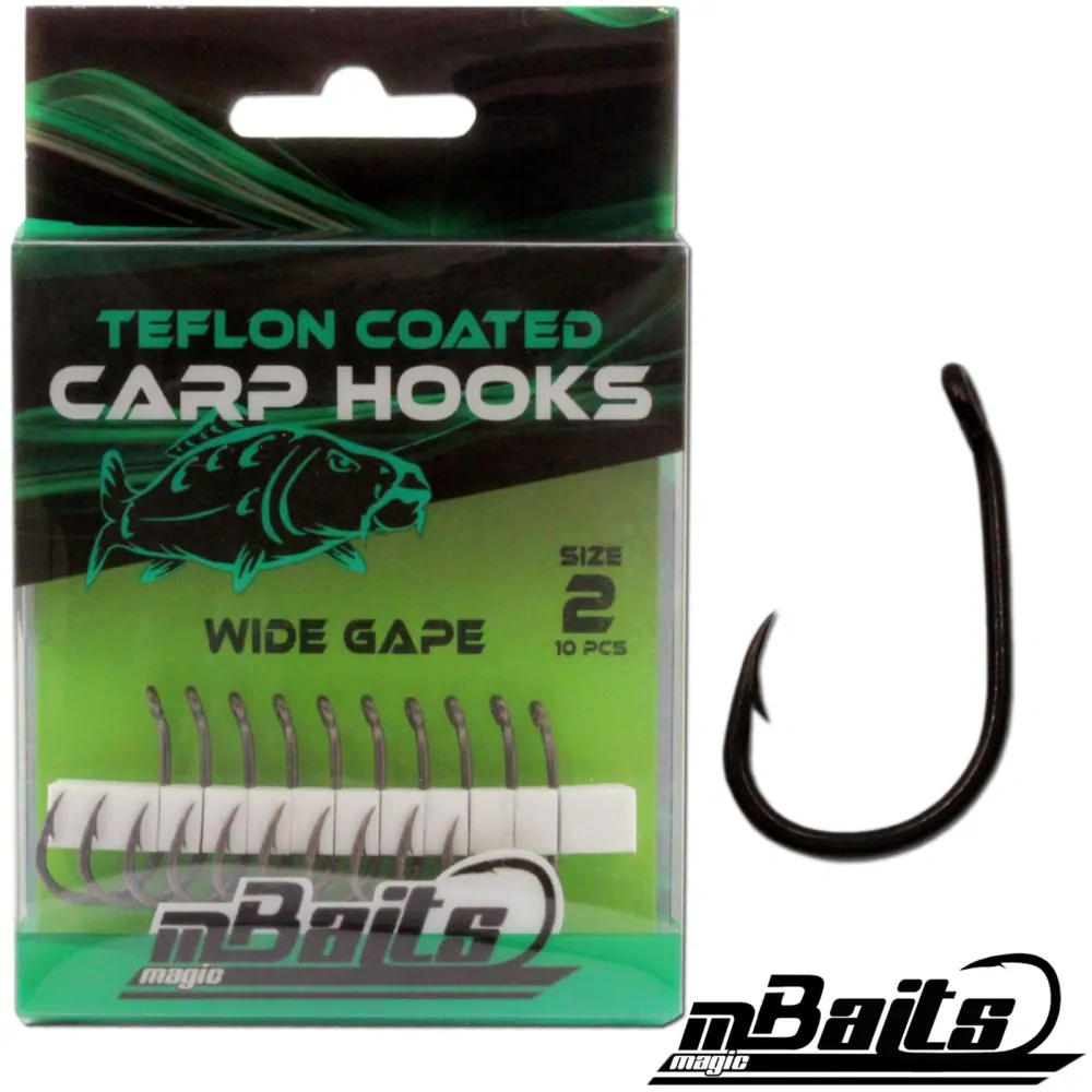 Kaprový háček Magic Baits Wide Gape je vyroben z vysoce kvalitní uhlíkové oceli, která je extrémně odolná proti rozbití. Matný, nereflexní teflonový povlak je pod vodou zcela nenápadný. Tvar kaprových háčků je klasický s krátkou stopkou háčku a mírně dovnitř skloněnou špičkou háčku. Krátká stopka háčku nabízí malou páku pro prořezávání a je ideální pro obtížné vody.